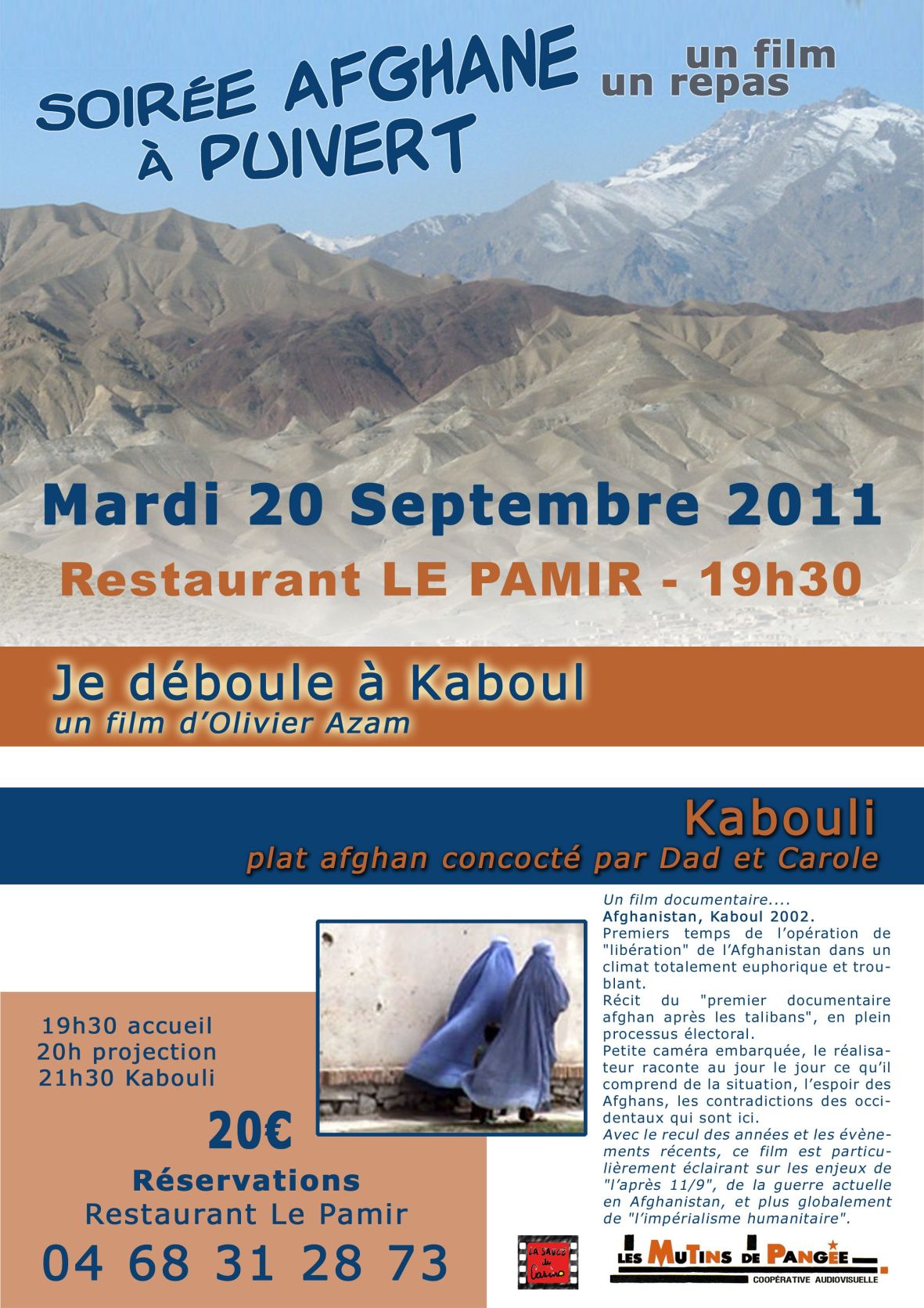 L’association La Sauce du Casino vous invite à une soirée hors les murs, pendant la période de fermeture du cinéma Le Casino à Lavelanet. Ce rendez vous d’actualité, aura lieu à Puivert au restaurant Afghan le PAMIR, chez Dad et Carole mardi 20 septembre dès 19h30. La projection sera suivie du traditionnel Kabouli, spécialement préparé pour nous par Dad .