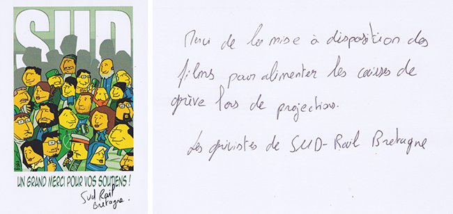 Nous vous remercions une fois encore de nous avoir permis de diffuser votre film sans supporter de frais. Comme convenu, nous avons remplacé une billetterie par la circulation d’une caisse de grève qui sera confiée à l’UD CGT du 82. Nous avons donc organisé 3 diffusions, suivis de débats et profité de la présence de Marianne, collaboratrice au Centre International de Recherche sur l’Anarchie pour l’animer. Chez les trois associations, les commentaires sur le film ont été élogieux et l’ambiance chaleureuse.