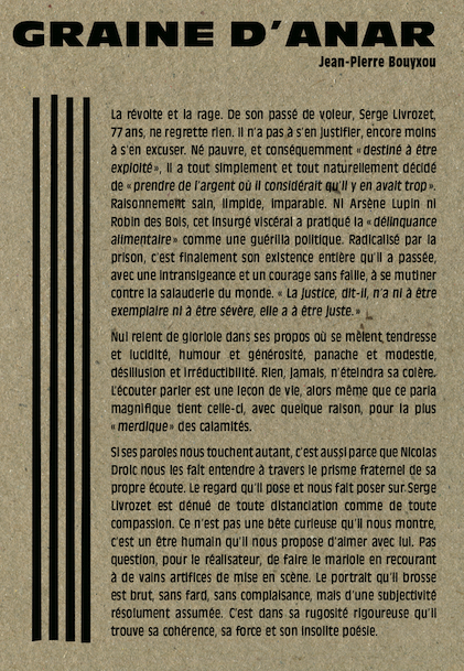 "Né pauvre, et conséquemment destiné à être exploité, il a tout simplement et tout naturellement décidé de prendre de l’argent où il considérait qu’il y en avait trop. Ni Arsène Lupin ni Robin des Bois, cet insurgé viscéral a pratiqué la délinquance alimentaire comme une guérilla politique. Radicalisé par la prison, c’est finalement son existence entière qu’il a passée, avec une intransigeance et un courage sans faille, à se mutiner contre la salauderie du monde" (Jean-Pierre Bouyxou). Devant la caméra intimiste de Nicolas Drolc, cet "anarchiste qui n’aime pas les bombes" se laisse dresser le portrait en n’étant tendre ni avec lui-même, ni avec la vie et les plaisirs qu’il y recherche pour "rendre ce séjour merdique le moins désagréable possible".
