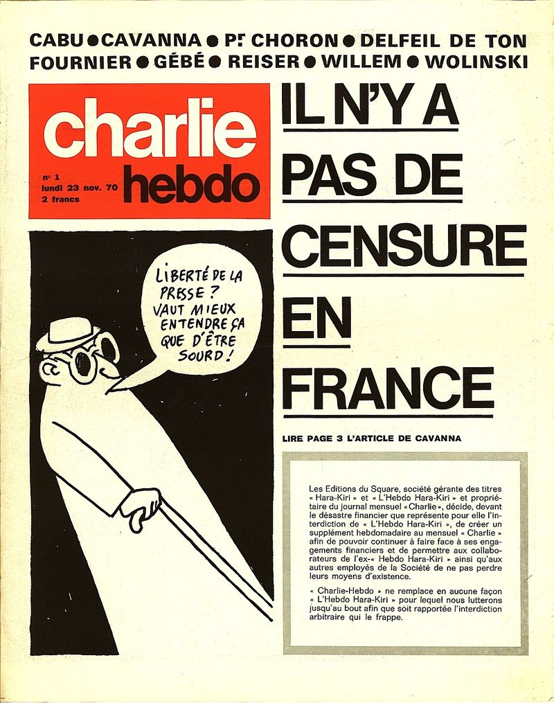 Les fondateurs de Charlie Hebdo étaient Cavanna et Choron... après l’interdiction de Hara-Kiri en 1970. Puis il y eut la déplorable reprise orchestrée par le sinistre Philippe Val, l’éviction peu glorieuse du génial Siné en 2008, la lente dégradation éditoriale et l’horrible massacre du 7 janvier 2015 qui marquent pour toujours, de sang et de larmes, l’histoire du dessin de presse. Rien ne peut vraiment être pardonné, tout a changé et la liberté d’expression en a pris un coup sur le museau. Quelques traces de ces personnages qui ont été les premiers Charlie : |