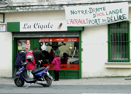 La Cigale est un bureau de tabac, presse et librairie « régionaliste » puis finalement généraliste où l’on peut trouver des tas de bouquins au fil des rencontres et des lectures du buraliste, des épiciers de Tarnac aux apiculteurs du coin en passant par des livres pour enfants ou des grands classiques de la littérature… On peut même y trouver les dvds des Mutins de Pangée et le livre de François Fillon ! La Cigale est bien placée, puisqu’elle est sur la route principale qui traverse Saint-Pons-de-Thomières, ce village d’environ 2000 âmes au cœur de la vallée du Jaur, dans les hauts cantons de l’Hérault. Autrement dit un endroit de passage… Et le fait qu’il s’agisse d’un bureau de tabac-presse est une contrainte qui s’est vite transformée en force, grâce au génie du lieu, Pierre Blondeau, le buraliste donc. Car depuis des années qu’il ouvre, à partir de six heures du matin, tout Saint-Pons a défilé dans sa boutique, au départ pour acheter des clopes, gratter des jeux, bouffer des bonbons, lire le Midi Libre… Et ceux qui n’ont pas fui chez la concurrence, y rencontrent d’autres gens, d’autres idées, le contraire de l’entre soi, le avec les autres.