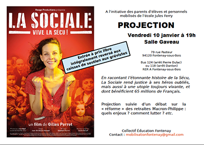 19h00 : Projection de La Sociale de Gilles Perret à la salle Gaveau (79, rue Pasteur à Fontenay sous Bois), organisée par un collectif de parents d’élèves et instits de Fontenay sous Bois.