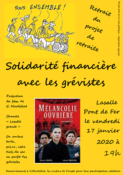 19h : Projection du film Mélancolie ouvrière de Gérard Mordillat au Pont de fer à Lasalle, organisée par des citoyens grévistes ou non et avec le concours des éditions du Cerisier, de solidaires, du groupe d’action France Insoumise de la vallée de Salendrenque.