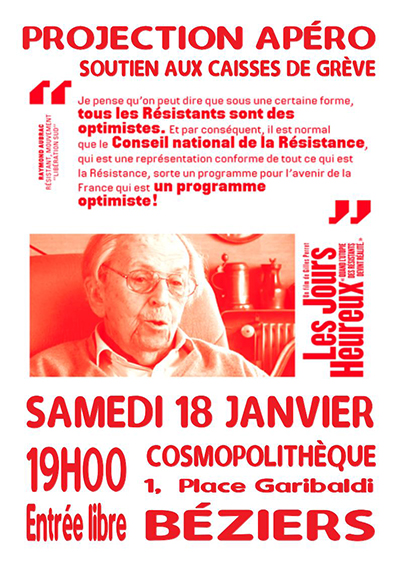 19h : Projection de Les jours heureux de Gilles Perret à la Cosmopolithèque (1 place Garibaldi à Béziers).