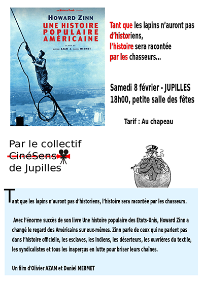 18h : Projection du film Howard Zinn, une histoire populaire américaine d’Olivier Azam et Daniel Mermet, organisée par le Collectif CinéSens de Jupilles à la petite salle des fêtes.