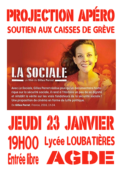 19h : Projection Apéro de La Sociale de Gilles Perret au Lycée Loubatières d’Agde.