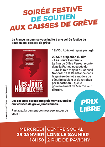 La France Insoumise invite à une soirée festive de soutien aux caisses de grève au Centre Social de Lons-le-Saunier (2 rue de Pavigny).