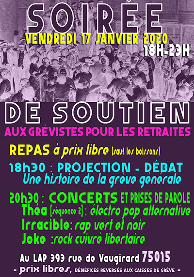 18h30 Soirée concerts et projection du film Une histoire de la grève générale d’Olivier Azam et Laure Guillot en soutien aux grévistes de l’éducation, au LAP (lycée autogéré de Paris).