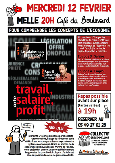 20h : Projection des épisodes 3 et 4 de la série Travail, salaire, profit de Gérard Mordillat et Bertrand Rothé, organisée par le collectif Grèvenmellois au Café du Boulevard à Melle (Deux-Sèvres).