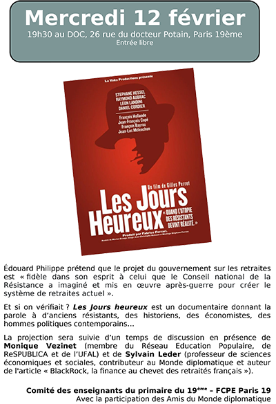 19h30 : Projection du film Les jours heureux de Gilles Perret au DOC (26 rue du docteur Potain), organisée par un collectif de parents et personnels des écoles dans le 19ème arrondissement, avec la participation des Amis du Monde diplomatique.
