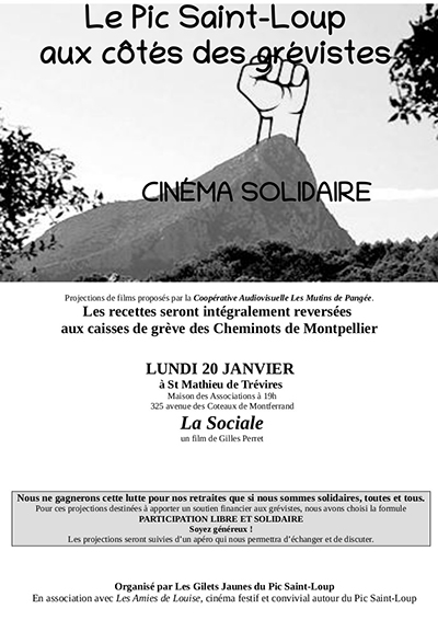 Cette projection est organisée par "Les gilets jaunes du Pic Saint Loup" en association avec "Les Amies de Louise", cinéma festif et convivial autour du Pic Saint-Loup.