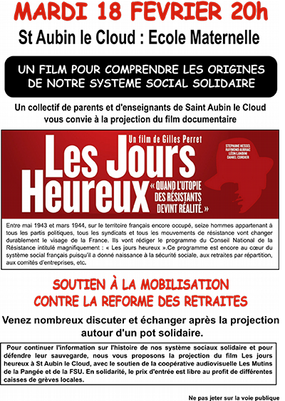 20h : Projection du film Les Jours heureux de Gilles Perret dans la salle de motricité de l’école maternelle de Saint Aubin le Cloud (79130), organisée par un collectif d’enseignants et de parents d’élèves.